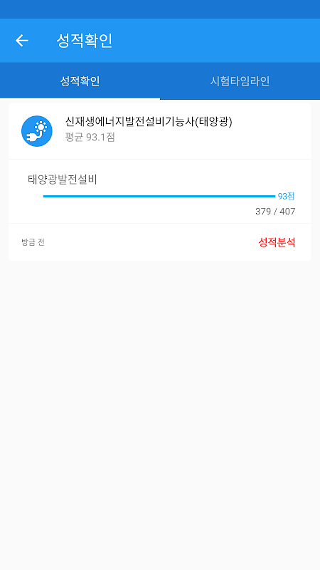 성적확인 - 각 과목별 성적 및 그동안 풀어본 기출문제와 모의고사, 문제풀기의 성적을 볼 수 있습니다.