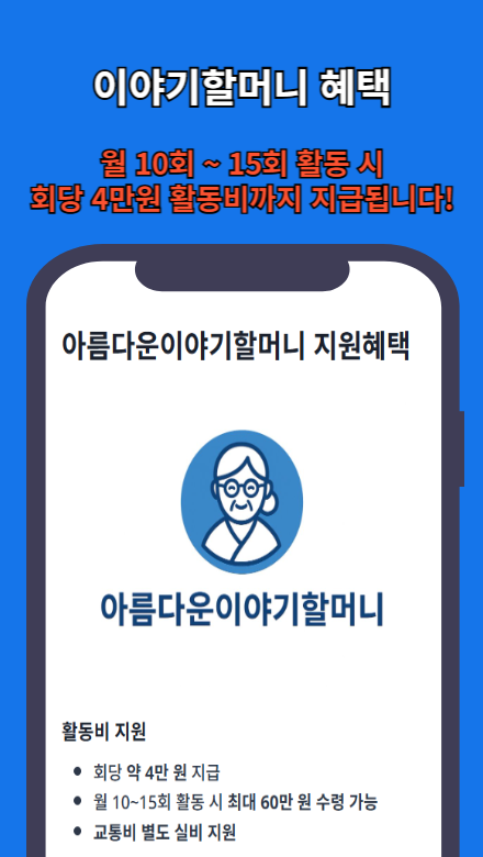 ‘Beautiful Story Grandmother’ adalah proyek yang didukung oleh Kementerian Kebudayaan, Olahraga, dan Pariwisata, di mana para lansia berusia 56 tahun atau lebih menceritakan dongeng tradisional kepada bayi dan siswa sekolah dasar.
