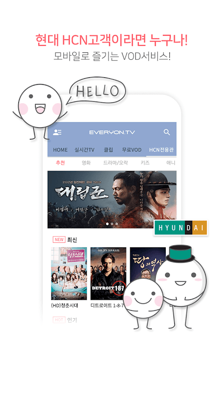 Tonton lebih dari 100 saluran dan klip langsung / VOD gratis. Anggota Hyundai HCN dapat menikmati berbagai konten di ruang eksklusif Hyundai HCN!