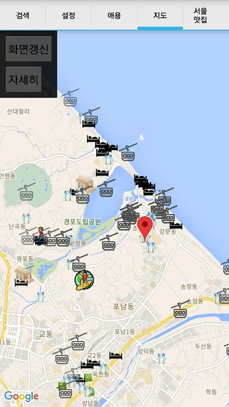 지도위에 임의의 위치을 클릭하고, '화면갱신' 버튼을 눌러도 다양한 취향에 맞는 장소를 찾아준다.