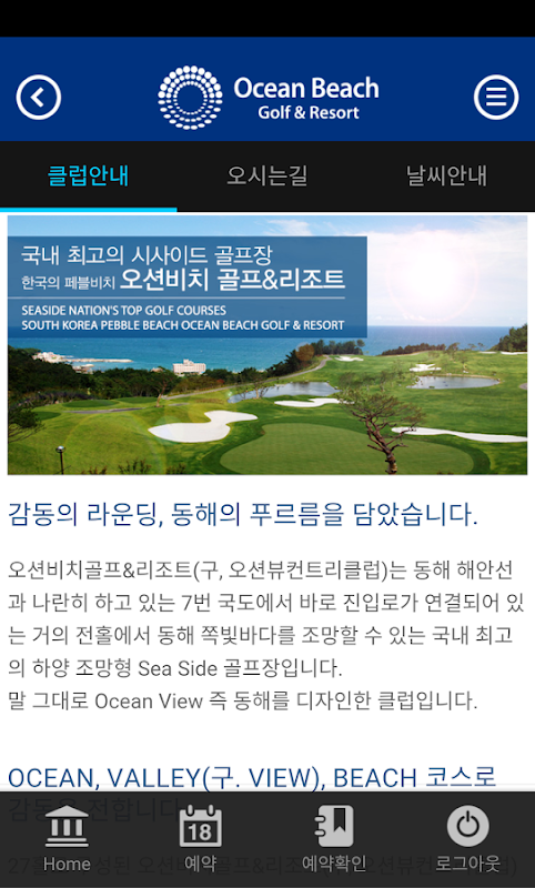 오션비치골프&리조트(구, 오션뷰컨트리클럽)는 동해 해안선과 나란히 하고 있는 7번 국도에서 바로 진입로가 연결되어 있는 거의 전홀에서 동해 쪽빛바다를 조망할 수 있는 국내 최고의 하양 조망형 Sea Side 골프장입니다.