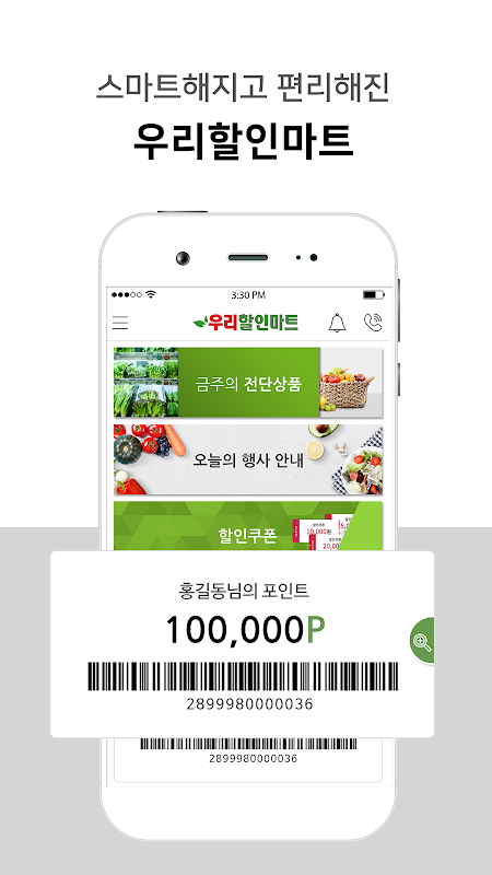 - 우리할인마트의 포인트 카드를 모바일로 편리하게 이용하시고, 언제 어디서든 포인트를 확인하실 수 있습니다.
