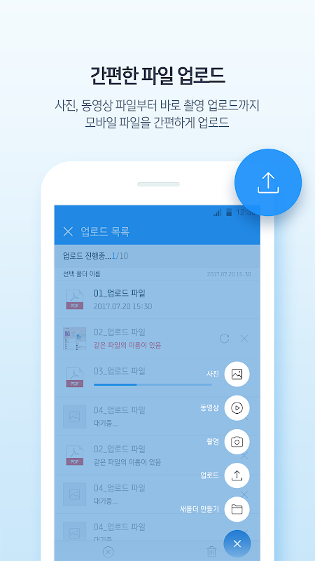간편한 파일 업로드 - 사진, 동영상 파일부터 바로 촬영 업로드까지 모바일 파일을 간편하게 업로드