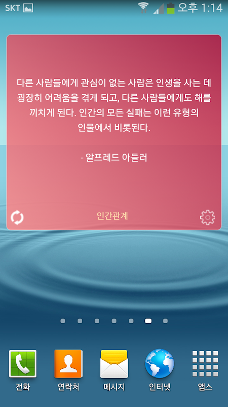 인간관계 힐링위젯는 참좋은글 톡톡힐링의 명언(인간관계)들을 앱을 실행하지 않고 스마트폰 바탕화면에서 자동 갱신되면서 읽어 볼 수 있는 위젯입니다.