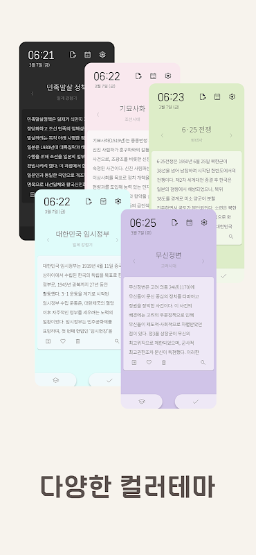 Saat Anda menghidupkan ponsel cerdas Anda, halaman sejarah Korea terungkap. Anda dapat menguasai sejarah Korea tanpa menghabiskan waktu ekstra. Manfaatkan kebiasaan mengecek smartphone puluhan kali sehari dan jadikan waktu luang itu menjadi kesempatan belajar.