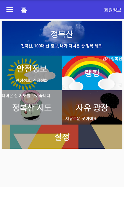 지역별 간단한 국내 산 검색 기능을 가지고 있으며 등산 매니아들에게 산들을 체크해 볼 수 있게 합니다.