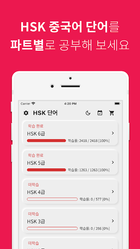 - Anda dapat mengatur atau mengatur ulang kemajuan belajar kata-kata Cina dengan menekan dan menahan bagian atau unit.