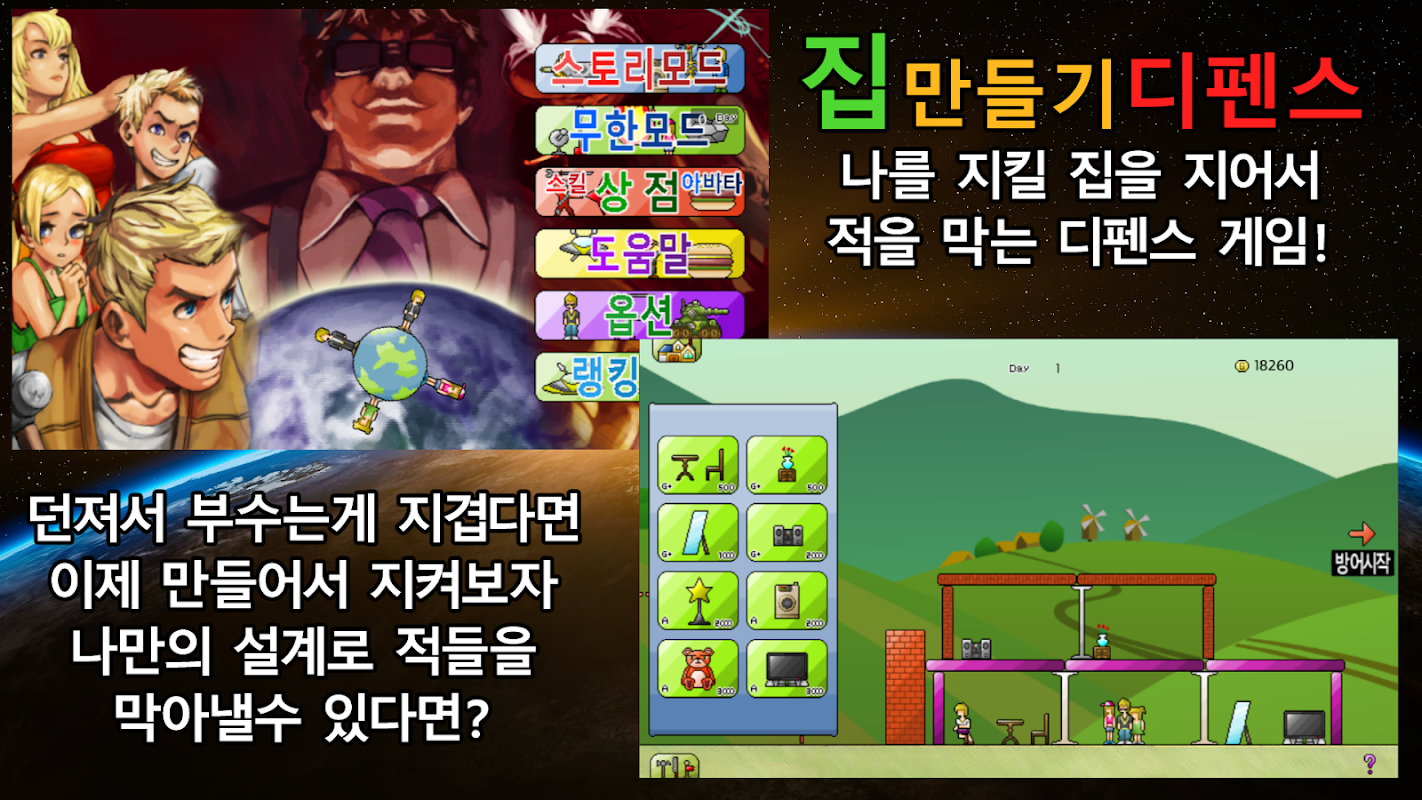 도트와 픽셀캐릭터로 이루어진 귀여운 그래픽 속에서 더이상 던지거나 설치하지 말고 직접 집을 디자인해 건축한뒤 적으로부터 지켜내 보세요! 픽셀 도트 건축 디자인 디펜스 게임에서
