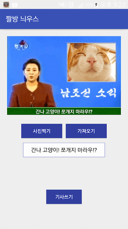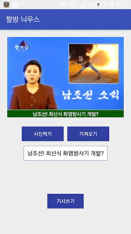 짤방 제조기 어플 짤방 늬우스는 인터넷 뉴스와 인민뉴스등을 짤방으로 만들 수 있습니다.(뉴스외의 다른 기능도 추가 작업 진행중)