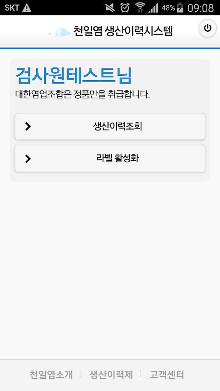 천일염 이력관리제 검사자용 앱입니다. 검사자만 로그인이 가능하니 일반 사용자는 "천일염 생산이력 조회"앱을 받아서 사용하시기 바랍니다