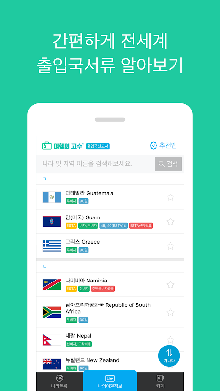 Anda dapat dengan mudah mencari dan menggunakan negara Anda. Fitur kenyamanan seperti benua, ABC, ㄱㄴㄷ fitur penyortiran.