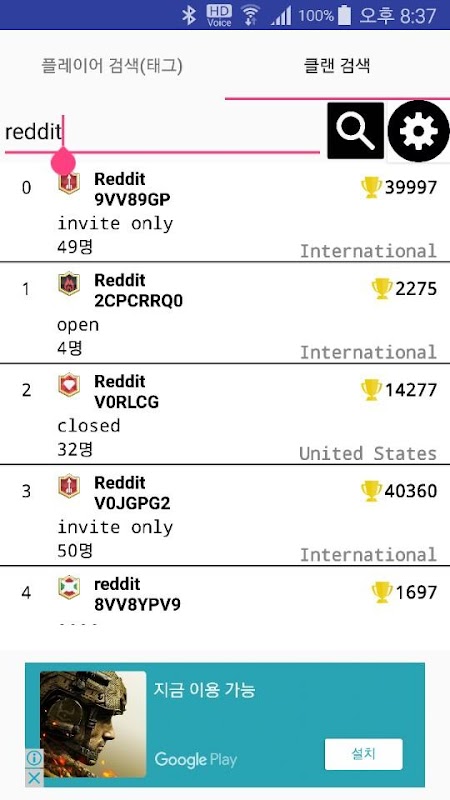 클랜 이름을 검색하여 클랜 정보와 멤버 목록을 확인 가능합니다.