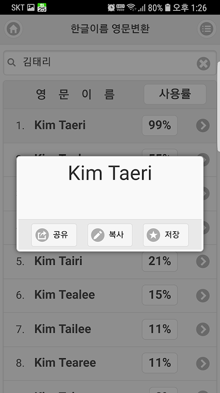 한글로 된 이름을 로마자(영문) 표기로 변환해주는 앱입니다. 현행 로마자 표기법을 따라 변환한 이름과 통계적으로 많이 사용되고 있는 로마자 이름도 함께 제안 받을 수 있습니다.