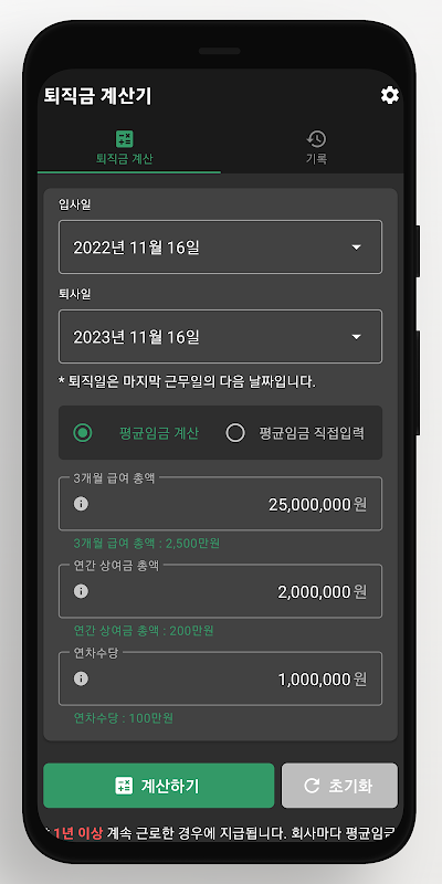 ● Anda dapat dengan mudah menghitung informasi pesangon dengan mengambil informasi yang tersimpan dalam catatan seperti tanggal kerja, tanggal pengunduran diri, total gaji selama 3 bulan, total bonus tahunan, tunjangan cuti tahunan, dan rata-rata upah harian.
