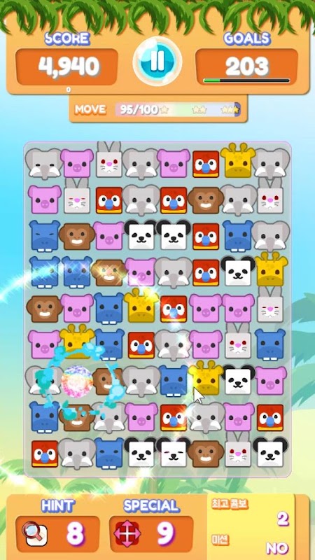 동물들을 움직여 같은 동물끼리 3마리 이상 가로 세로로 연결해 주세요.