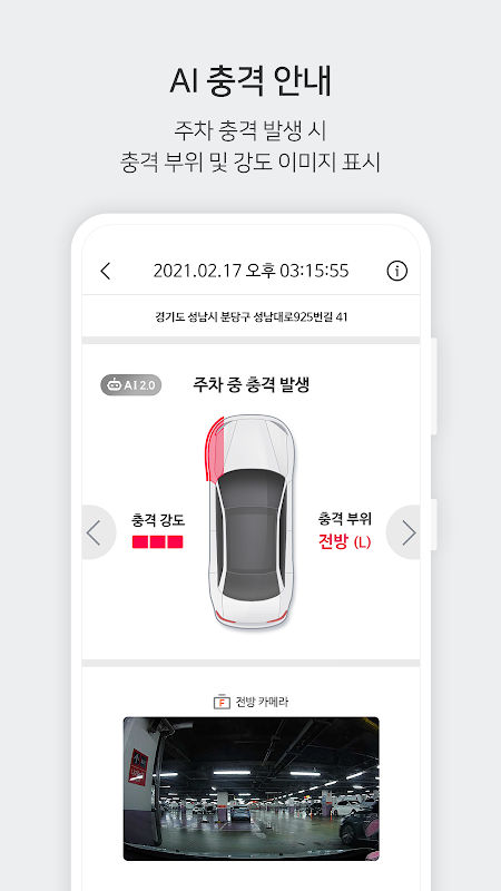 Algoritme dampak AI yang canggih memberikan panduan dengan mengelompokkan intensitas dan area dampak yang ditimbulkan pada kendaraan sebenarnya, tidak termasuk dampak rutin (membuka dan menutup pintu kendaraan, bagasi, dll) saat parkir.