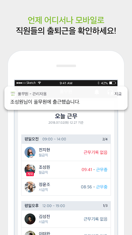 관리자는 사업장에 없어도 직원들의 출퇴근 상황을 실시간으로 확인할 수 있습니다.