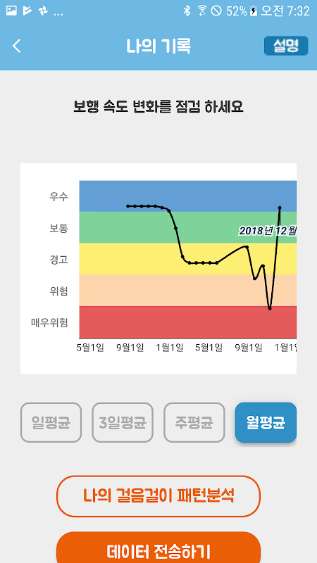 [보행 평균속도, 보폭, 균형감, 발각도 분석]