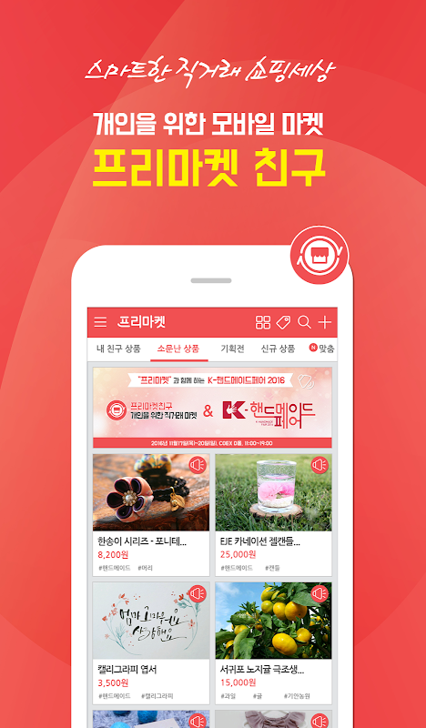 핸드메이드, 중고, 소호상품 개인 및 소상공인을 위한 직거래 마켓 판매•등록 수수료 0 원클릭 상품등록 지인 기반 알고리즘을 통한 안전한 거래