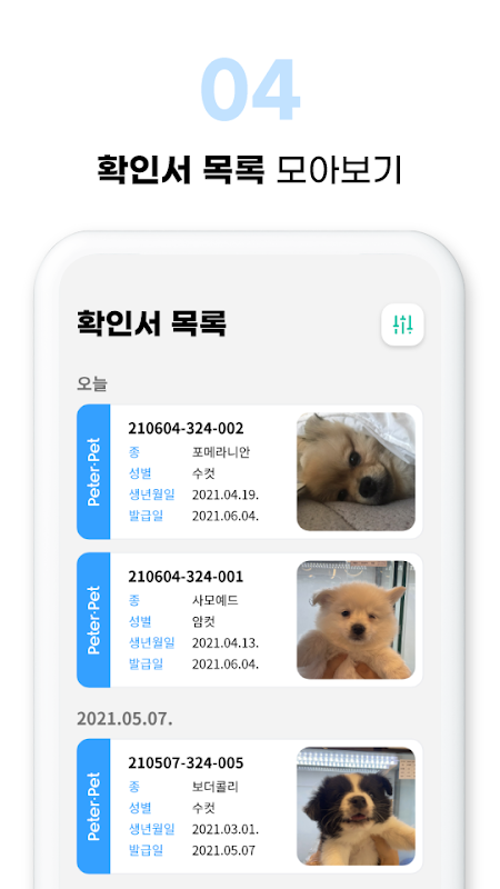 - 검진 확인서 관리 : 동물병원에서 발급받은 검진 확인서 내역을 통합적으로 관리할 수 있습니다.