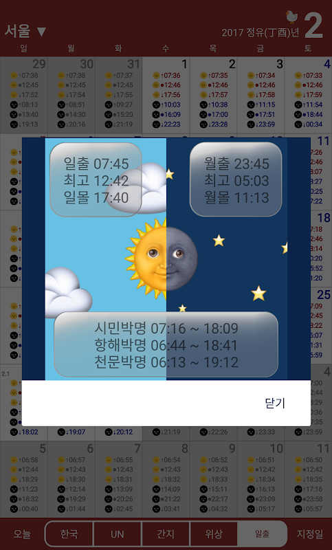 Korea kalender berisi kalender untuk berbagai tahapan, kalender default matahari terbit / tenggelam kalender, serta Hari PBB, kanji, bulan.