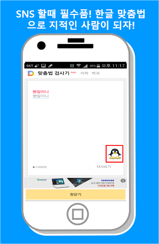 채팅, SNS할때 언제 어디서든 귀여운 펭귄 아이콘을 클릭시 바로 맞춤법 검사가 가능합니다.