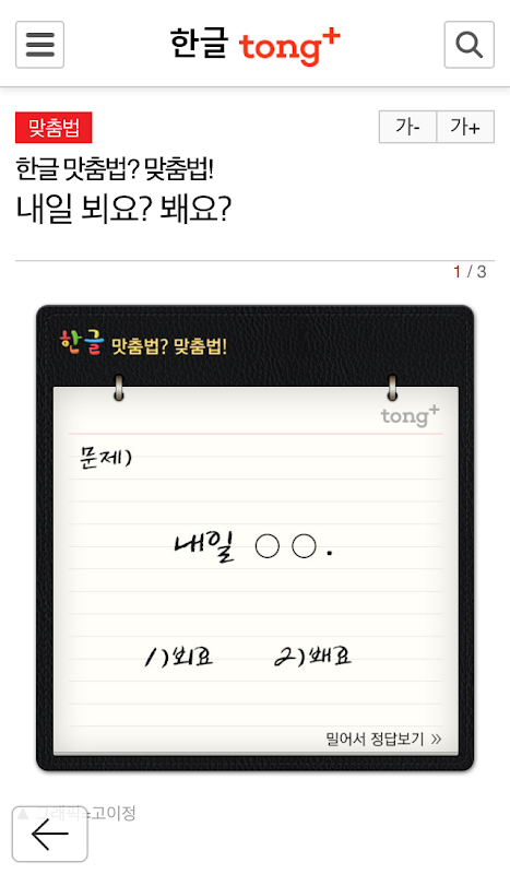 헷갈리는 한글 맞춤법을 퀴즈 카드로 풀어 한 눈에 쏙쏙 이해 됩니다.