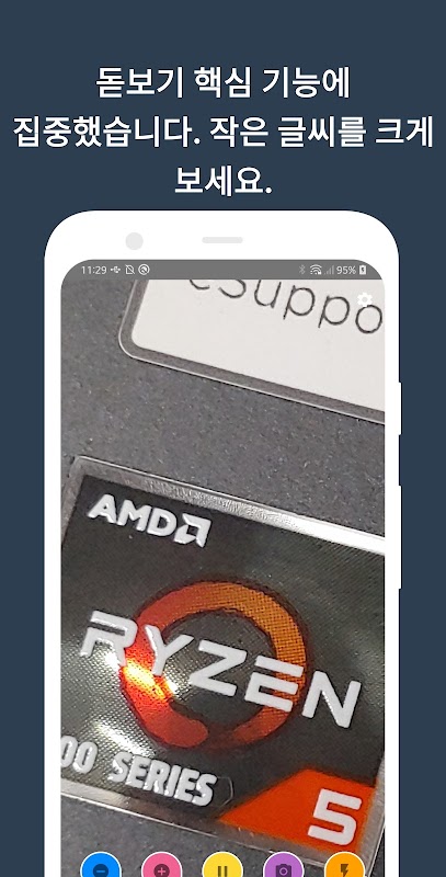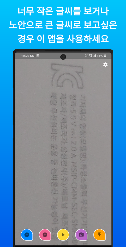 Aplikasi kaca pembesar. Membantu dengan presbiopia yang ingin melihat cetakan halus dengan jelas atau tidak dapat melihatnya dengan baik.