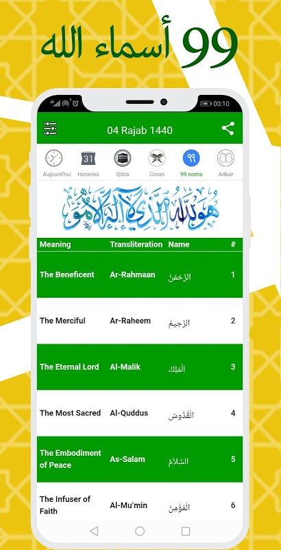 أوقات الصلاة الإسلامية ، القبلة ، الأذان ، القرآن ، 99 أسماء الله الحسنى ، أدكار
