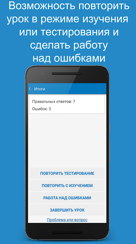 Pelajaran (di bagian “Kata-kata”) dapat diadakan dalam mode belajar untuk menghafal kata-kata baru, atau dalam mode pengujian untuk menilai pengetahuan dan mengkonsolidasikan apa yang telah dipelajari. Anda dapat mengambil kesempatan untuk membuat daftar belajar Anda - "Dipilih". Setelah pelajaran, aplikasi menawarkan untuk melakukan pekerjaan pada kesalahan, atau mengulangi pelajaran secara keseluruhan dalam mode studi atau pengujian. Selain itu, semua kesalahan terbaru dicatat di bagian "Kesalahan terbaru", yang memungkinkan Anda menyelesaikan kata-kata yang menyebabkan kesulitan. Kata-kata terkenal dapat diberi label sebagai "Dipelajari."