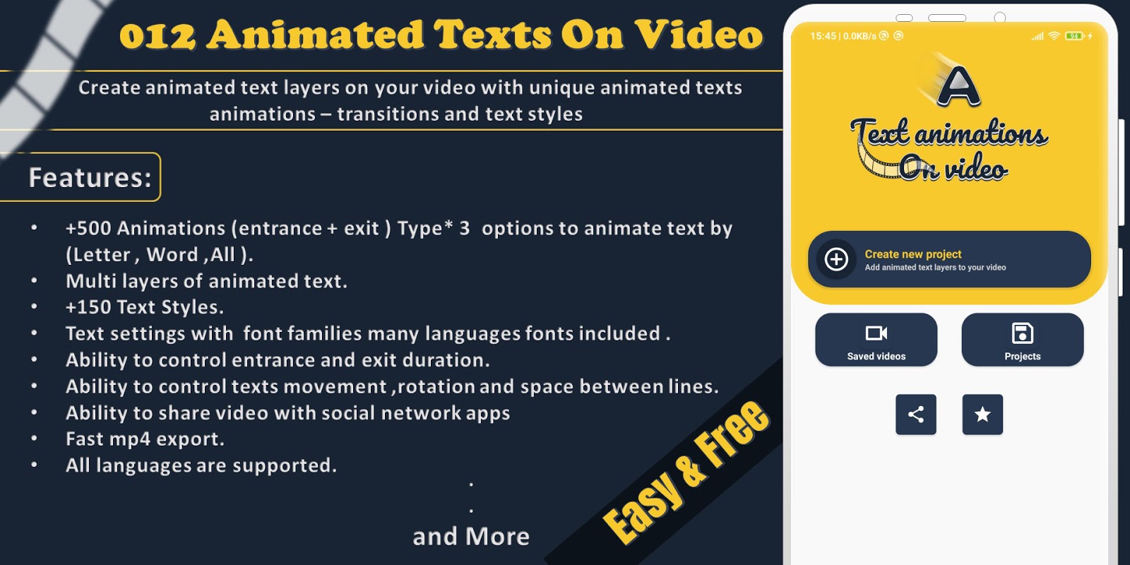 Teks animasi 012 gratis di video disebut juga 012 pembuat video ini memungkinkan Anda untuk membuat "efek" video teks animasi yang indah dengan begitu banyak "efek" jenis animasi dan begitu banyak gaya teks unik dengan cara yang paling sederhana dan mudah, Anda dapat dengan mudah membuat teks animasi tanpa keahlian yang diperlukan, Anda dapat menambahkan teks animasi pada video untuk media sosial atau tujuan apa pun.