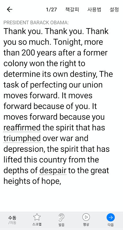 - 3단계 쉐도잉 : 원음을 듣고 0.5초 안에 동시에 발음이 되면 "마스터"
