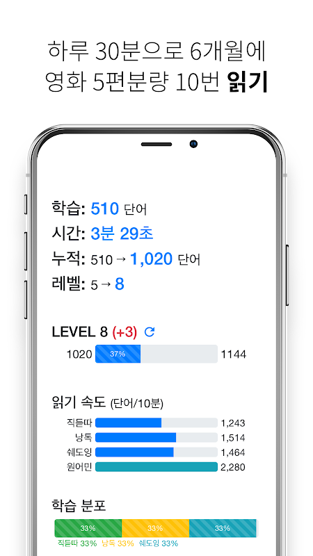 저는 6개월 동안 10만 단어, 1만 문장 정도를 읽었습니다. 영화로 치면 6~7편 정도 됩니다. 6개월간 하루 1시간씩 해서 전체를 10번 정도 읽었습니다. 읽기 전용 UI로 같은 걸 반복해서 읽기 때문에 갈수록 익숙해져 나중엔 1시간에 영화 한편 분량도 읽을 수 있었습니다.
