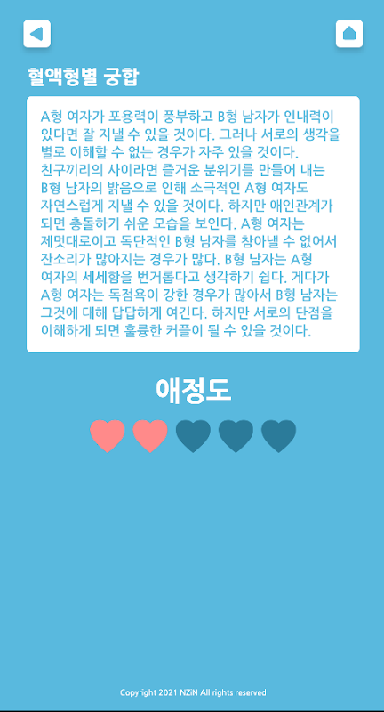 남자의 혈액형, 여자의 혈액형을 선택 후 결과보기버튼을 터치하면 서로간의 궁합이 표시됩니다.