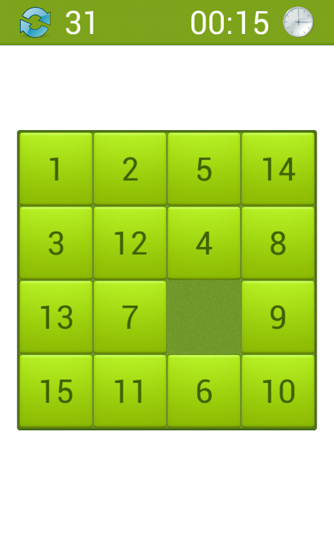 This puzzle consists of a frame of numbered square tiles in random order with one tile missing. The object of the puzzle is to place the tiles in order by making sliding moves that use the empty space