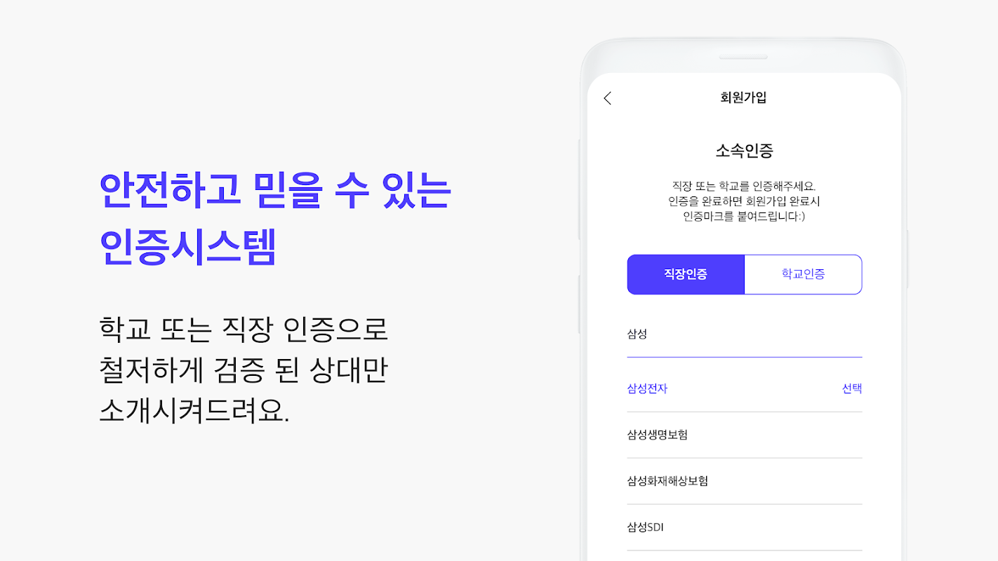 소속 인증 절차가 다른 소개팅 앱보다 조금은 불편하실 수 있지만 고객님에게 보다 안전하고 신뢰할 수 있는 만남을 제공해드리기 위함이오니, 다소 불편함이 있으시더라도 이해 부탁드리겠습니다.