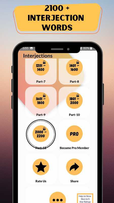 Aplikasi interjeksi dengan 2000+ interj. seperti hmm, boo, huh, oops, yay, yippee dll.