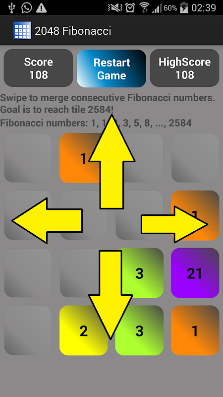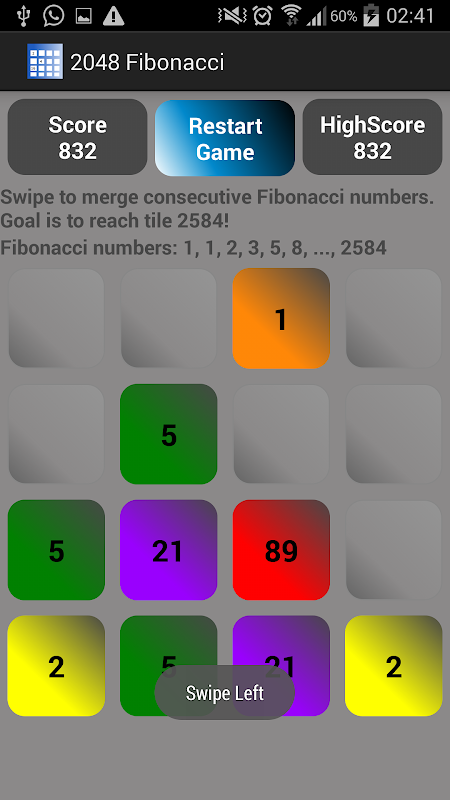 Fibonacci 2048. Permainan Matematika. Mainkan Fibonacci 2048 untuk mencapai sasaran ubin 2584