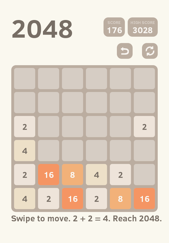 Swipe (Up, Down, Left, Right) to move the tiles. When two tiles with the same number touch, they merge into one. When 2048 tile is created, the player wins! 8 .. 16 ... 1024 .. 2048.
