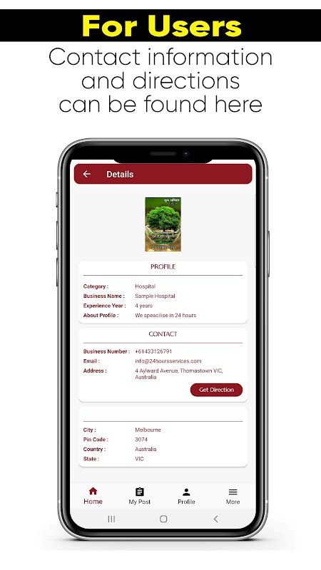 Aplikasi ini adalah portal iklan untuk bisnis yang tersedia 24 jam sehari, 7 hari seminggu, di seluruh dunia. Bisnis dapat menggunakan Layanan 24 Jam untuk mengiklankan diri mereka sendiri kepada pengguna global dengan biaya nominal. Ini adalah platform unik yang membedakan mereka dari bisnis lain dan memiliki uji coba gratis selama 90 hari.
