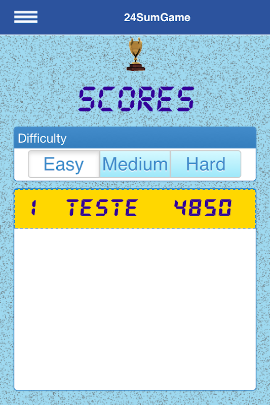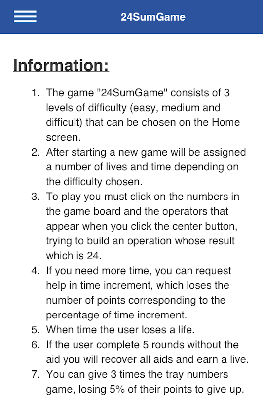 The game "24SumGame" consists of 3 levels of difficulty (easy, medium and difficult) that can be chosen on the Home screen.