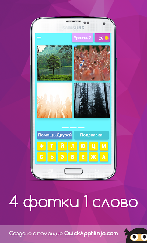 Как только начинается игра, Вы увидите на экране своего смартфона (планшета) 4 картинки и буквы. Ваша задача найти общее между фото - это и будет загаданное нами слово. Наберите его, используя буквы внизу экрана