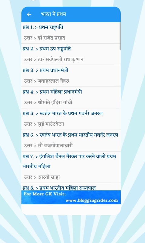सभी परीक्षाओ हेतु सामान्य ज्ञान एप हिन्दी भाषा में, इस एप में सामान्य ज्ञान के 70.000 से अधिक प्रश्न उत्तरो का समावेश किया गया जिस से प्रतियोगी परीक्षाओ की तैयारी करने में आसानी होगी! इस एप का दूसरा बड़ा फायदा यह है की यह पूरी तरह से बिना इन्टरनेट के भी इस्तेमाल की जा सकती है जिस से आपको कही ोई ोई समस्या