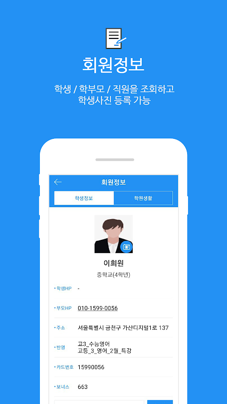 스마트폰에서 학원의 주요현황을 조회, 기록할 수 있고 학생의 학사정보를 언제 어디서나 실시간 기록, 조회할 수 있어 보다 효율적인 업무가 가능한 모바일 서비스입니다.