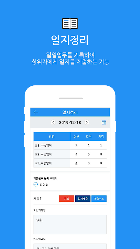해당반의 출석/과제/보강/진도/상담/일지정리 등 스마트폰에서 편리하게 학사관리가 가능한 서비스입니다.