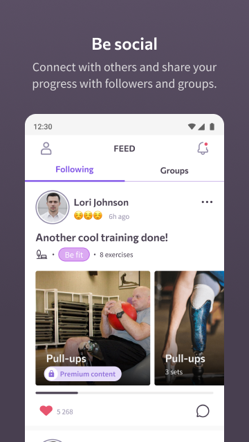 Terhubung dengan orang lain dan bagikan kemajuan Anda dengan pengikut dan grup.