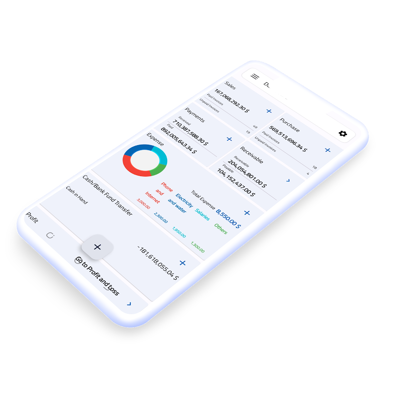 Dasbor: dasbor yang mudah digunakan yang memberi Anda pratinjau semua operasi Anda. Anda dapat melihat penjualan, pembelian, pengeluaran, laba dan rugi, akun hutang dan piutang, serta saldo kas dan bank saat ini, semuanya di satu tempat dengan akses cepat ke setiap Tindakan seperti Faktur Penjualan Cepat atau Faktur Pembelian Cepat.