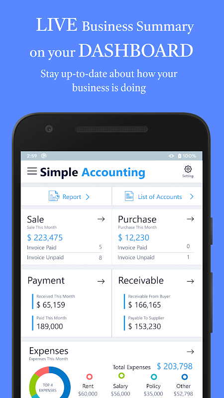 Pembukuan Akuntansi Sederhana membantu Anda mencatat semua transaksi Anda seperti Penjualan, Pembelian, Pembayaran, Pengeluaran, Pajak, dll. dengan cara yang sangat sederhana.