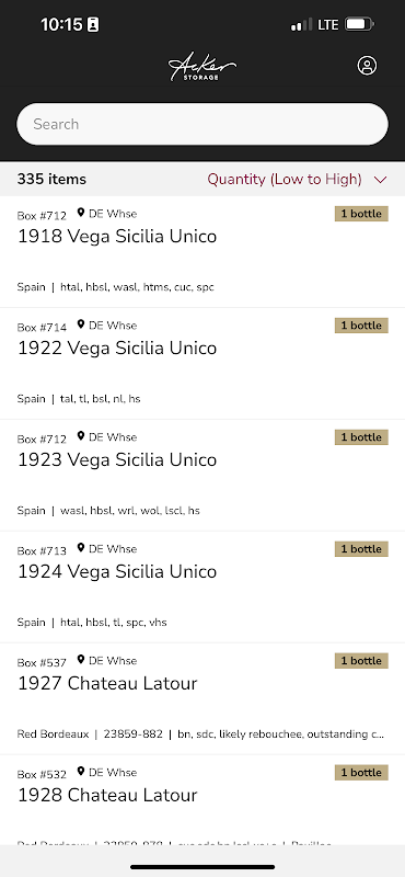 Aplikasi seluler Acker Storage memungkinkan pelanggan kami untuk melihat dan mengelola inventaris anggur mereka saat dalam perjalanan. Anda dapat melihat seluruh inventaris Anda dan mendapatkan detail tentang setiap anggur.