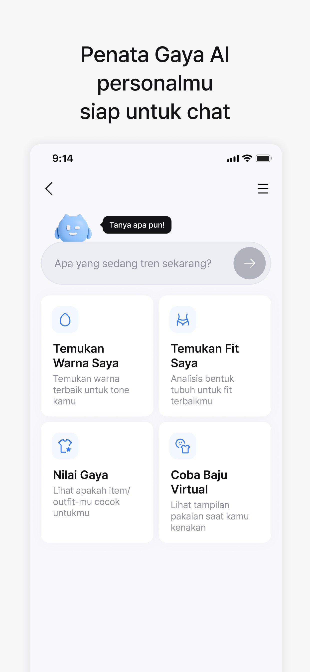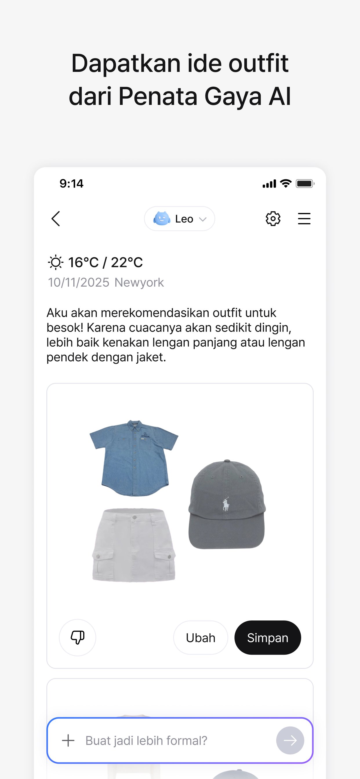 - Tanyakan apa saja tentang mode kepada penata gaya AI Anda, mulai dari "apa yang harus saya pakai hari ini?" hingga "apakah ini cocok?".
